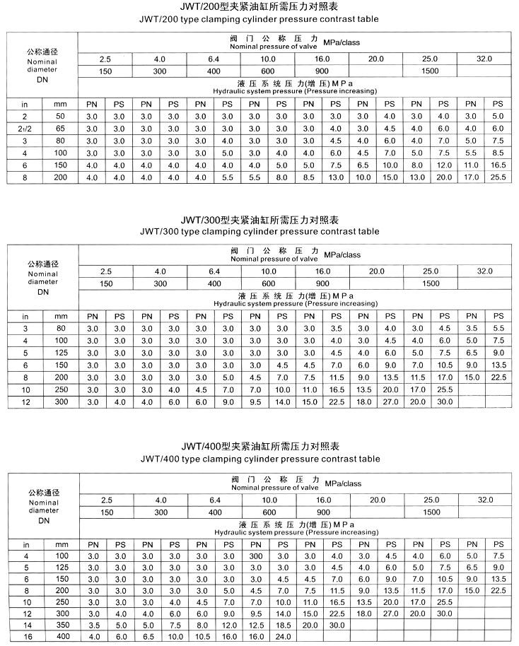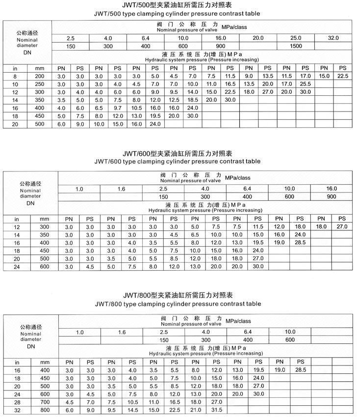 根據(jù)被試閥門公稱通徑和公稱壓力,調(diào)節(jié)電接點(diǎn)壓力表和被試閥門壓力相同。參照《壓緊油缸所需壓力對照表》將壓緊油缸壓力增壓到所需壓力要求。 (注:增壓按鈕可要多次點(diǎn)動,每次按動相隔時(shí)間需在5-10秒鐘左右)。