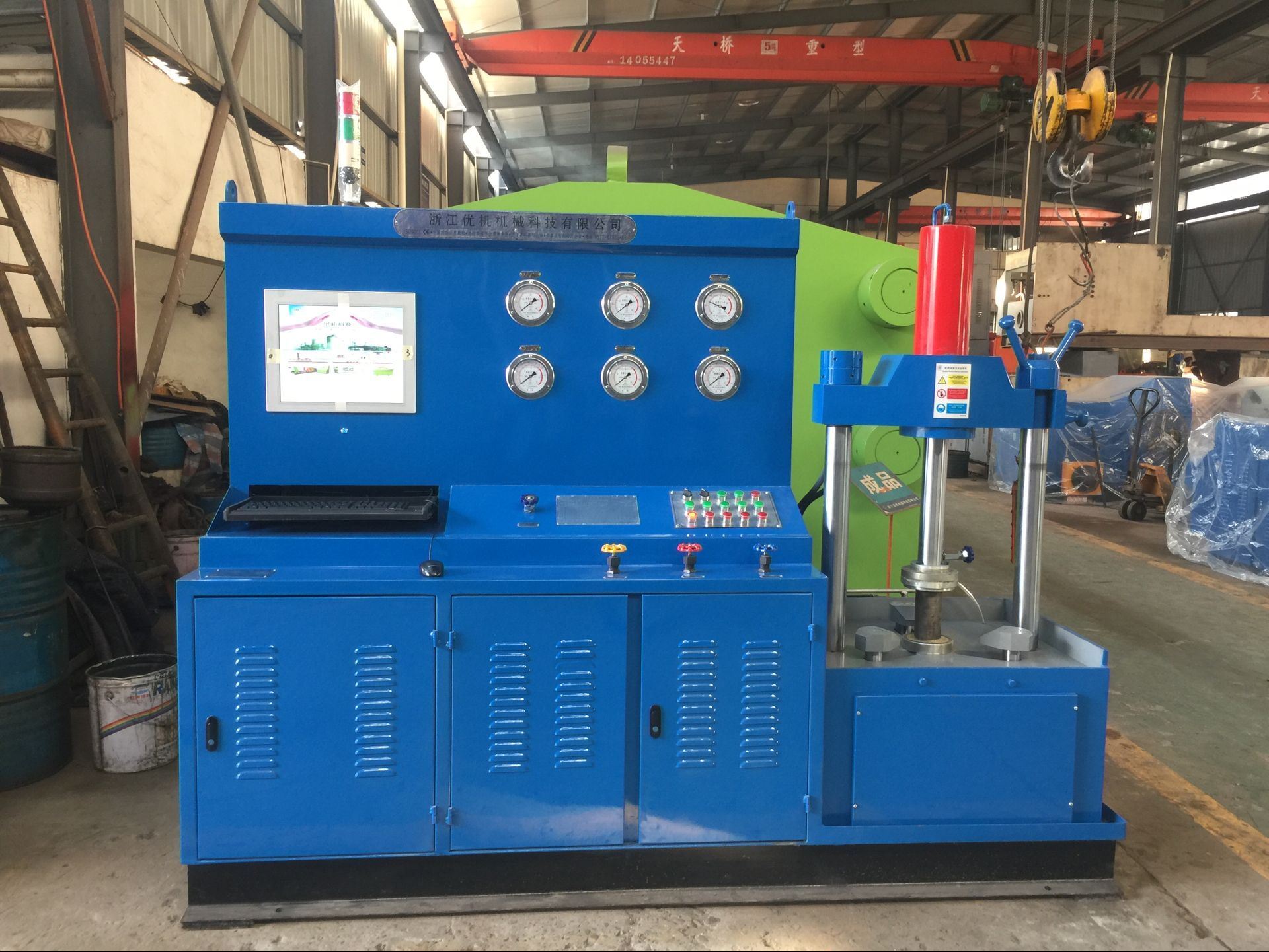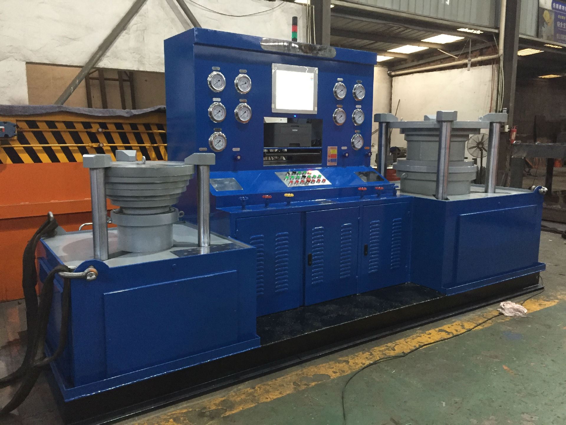工作過程:根據閥門的公稱通徑和壓力調整油缸壓緊壓力——壓緊工件——打開低水泵快速注水——打開高壓水泵——保壓計時——卸壓、復位。